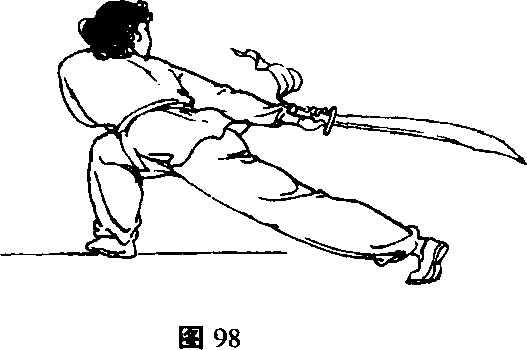 ②右脚向后退步,左腿膝关节弯屈;右手持刀,以腕为轴, 在右臂外侧剪腕花一周;目视前方(图97 )。