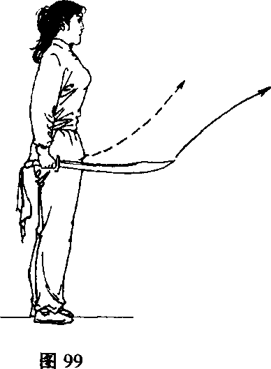 ①并步站立;右手握 刀垂于体侧,刀尖向前,左 臂垂于体左侧;目视前方 (图 99 )o