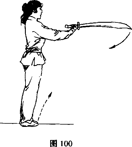 ①右手持刀上提,刀尖向下,刀刃向左,左臂内合,左掌置 于右腋下;目视前方(图102 )。
