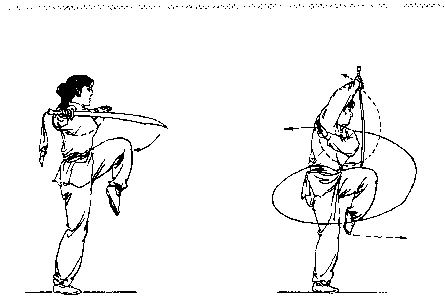 左腿屈膝上提;右手持刀,两臂内旋平分于体侧,刀刃向 右,刀尖向前;目视前方(图101 )。