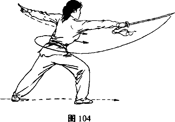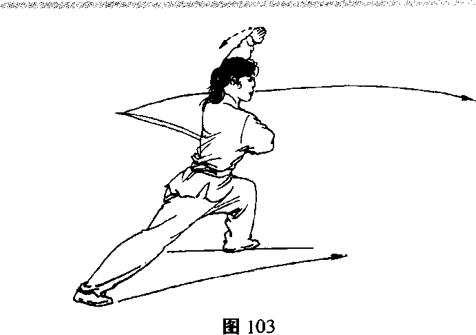 ②左脚向左前方下落成左弓步;同时右手持刀缠头,再向 左平扫藏于左腋下,刀尖向左后方,左掌弧形架于头上;目视 右前方(图103 )o