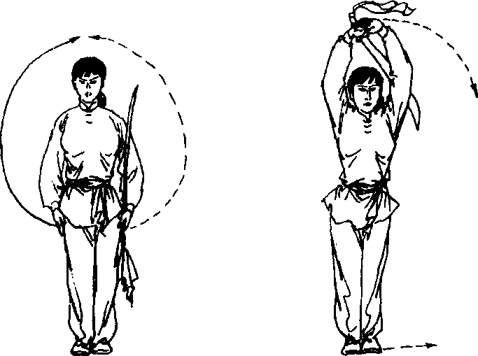 要点:缠头时,刀背必须贴脊背绕行;右手握刀向左平摆 时,旋臂扣腕要快速有力。