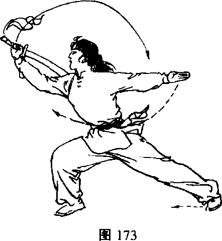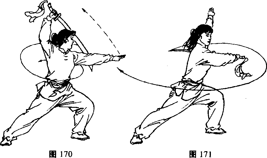 (1)左脚向左开步,膝关节弯屈;右手握刀,刀背贴身从身 体左侧绕至身后,左臂内旋向左伸出,与肩同高;目视左前方 (图 170 )o