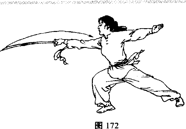 (2)上体左转;右腿膝关节伸直成弓步;同时右手握刀,刀 背继续贴身绕至右肩时,臂外旋下落于身体右侧,手心斜向 上,随之臂迅速内旋扣腕,向左肋侧平摆,刀背贴靠于左肋,刀 身平放,手心向下,刀尖向后,左臂上举至头部左上方成亮掌; 目视前方(图171 )。
