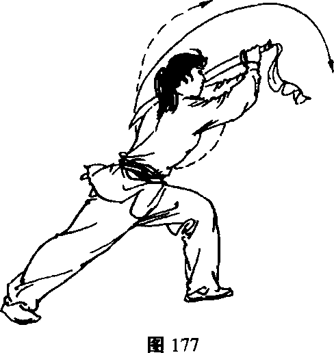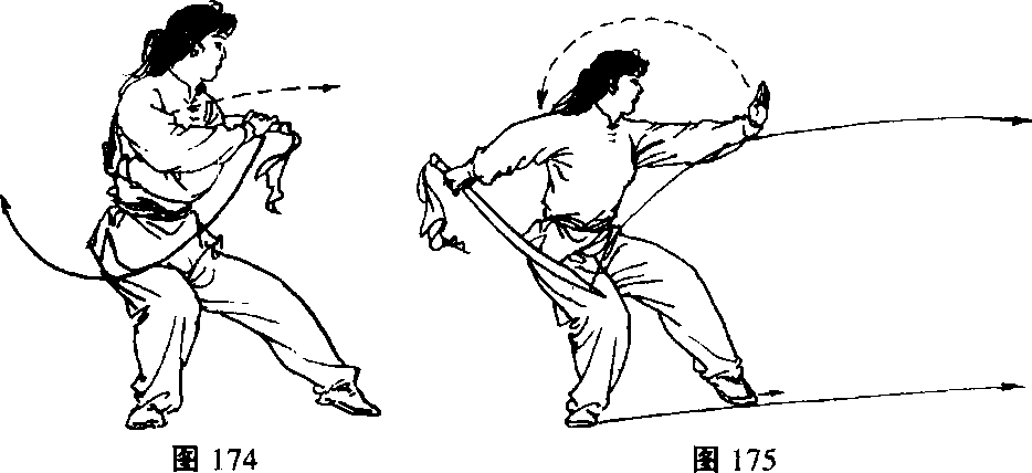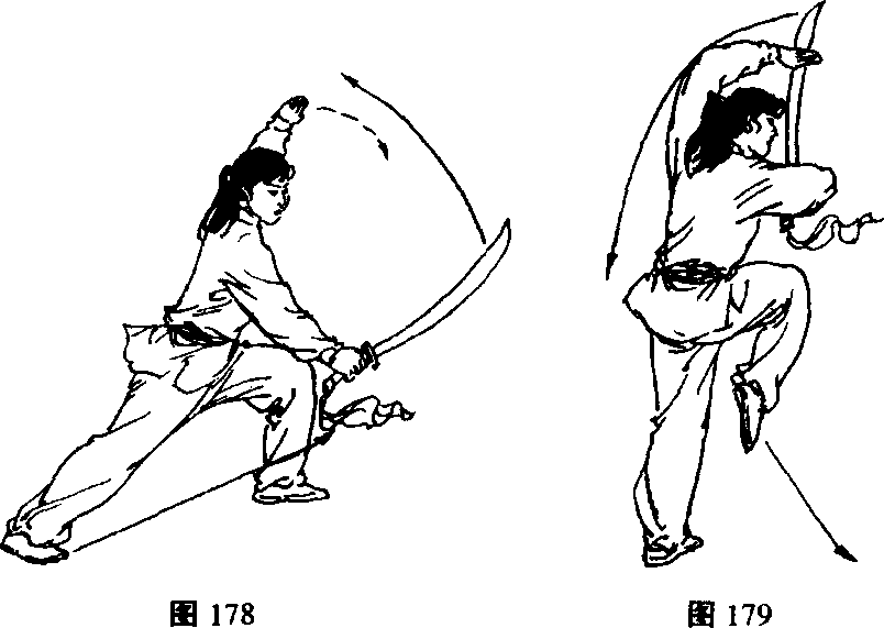(1)身体右转;右腿屈膝,左腿伸直;右手握刀随转体向右 平扫,左掌下落于身体左侧,略高于肩,手心斜向上;目视刀身 (图 172 )。