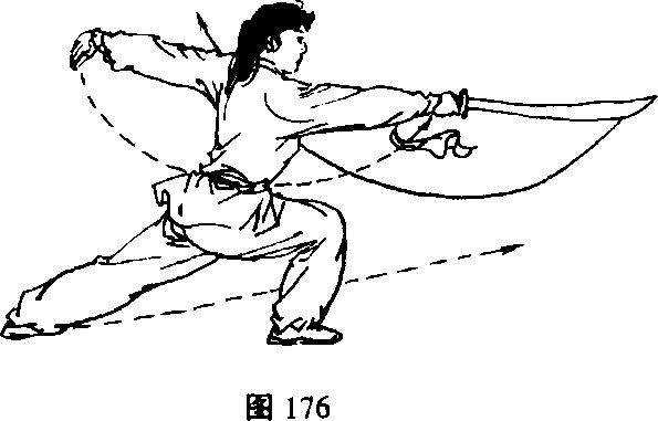 左脚稍前移,右脚向前上步,右腿屈膝,左腿膝关节伸直 成弓步;右手握刀向前直臂扎出,与肩同高,刀刃向下,左掌向 上、向后直臂绕环变勾手,略高于肩;目视刀尖(图176 )o