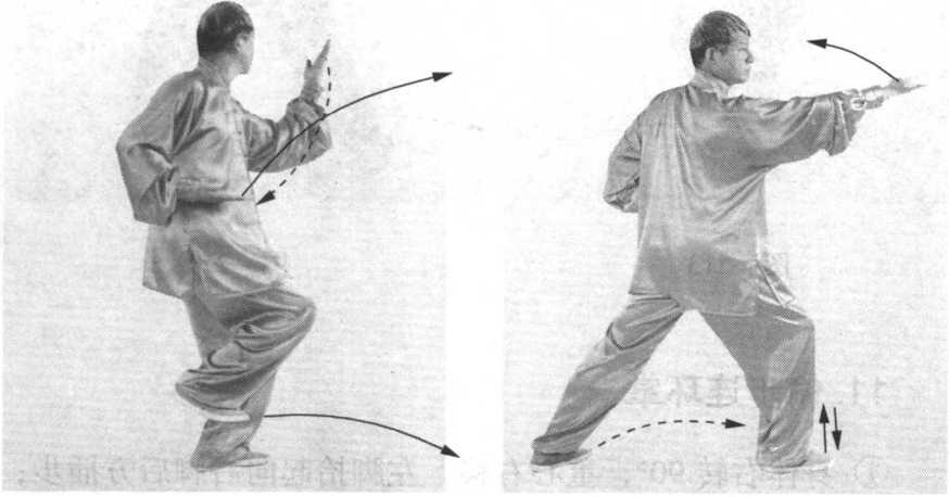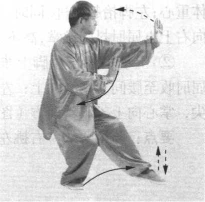 ① 重心前移,身体稍左转。左脚抬起原地震脚,略蹲支 撑身体重心;右脚抬起跟进。同时,左掌以拇指一侧为力点屈