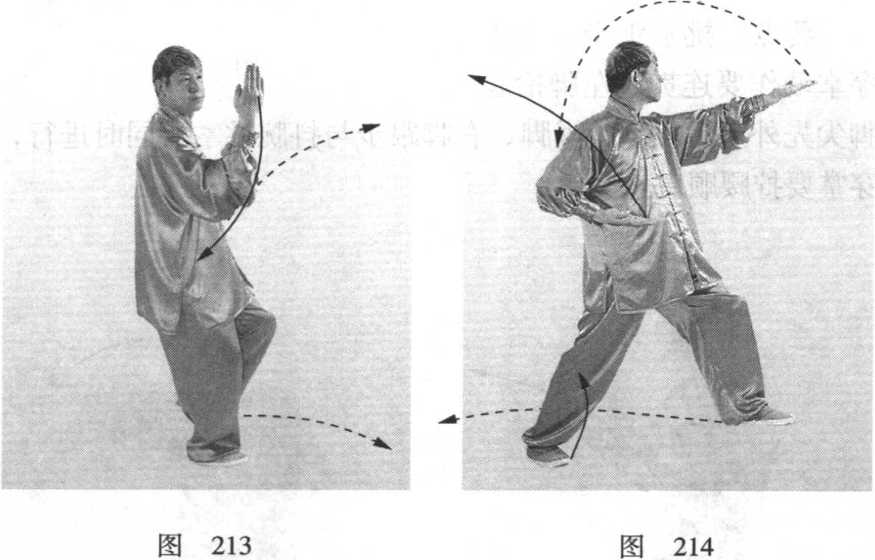 ① 重心稍后移,身体右转。右脚抬起原地震脚,略蹲支撑身 体重心;左脚抬起跟进。同时,左掌不动;右掌以拇指一侧为力点 向右上方屈肘抖腕挑掌,高不过头。眼看右掌(图213)。