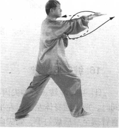 身体重心前移。右脚上步成右弓步。同时,左掌下落经 胸前屈肘收至右腋下,掌心向上,掌指向右;右掌向里、向 上经左掌上方直臂前穿,力达指尖,掌心向上。眼看前方