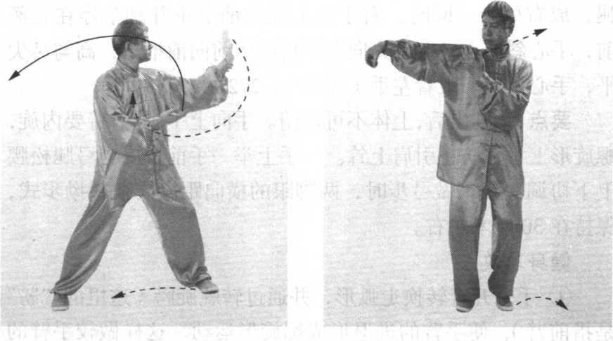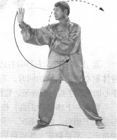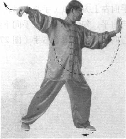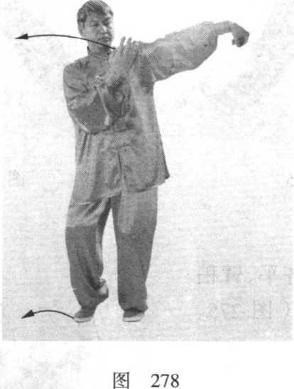 ① 上体后坐,身体重心逐渐移至左腿,右脚尖内扣。同 时,上体稍左转,两手(左高右低)向身体左侧弧形运转,左 手向上、向左画弧至身体左侧,与肩同高,手心向左;右手向 下画弧经腹前至左胸前,手心向后上方。眼看左手(图273)。