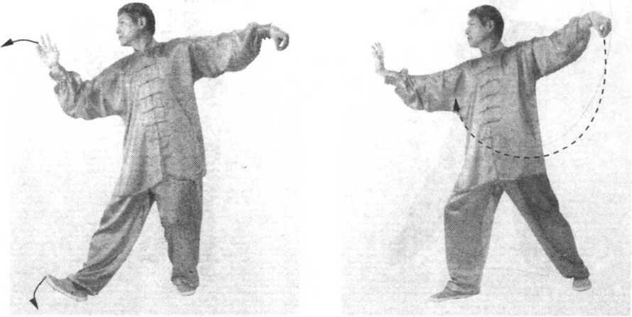 ② 上体右转,身体重心逐渐移至右腿,左脚向右脚靠拢, 脚尖点地。同时,右手向右上方画弧(手心由里转向外)至右 侧方时变成勾手,臂与肩平,勾尖向下;左手向下经腹前向右 上画弧至右肩前,手心向后上方。眼看左手(图274)。