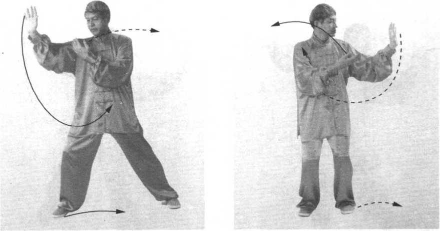 ③ 上体慢慢右转,身体重心随之逐渐右移。右手经脸前 向右侧画弧,手心渐渐转向右方;左手向左下经腹前向右上画