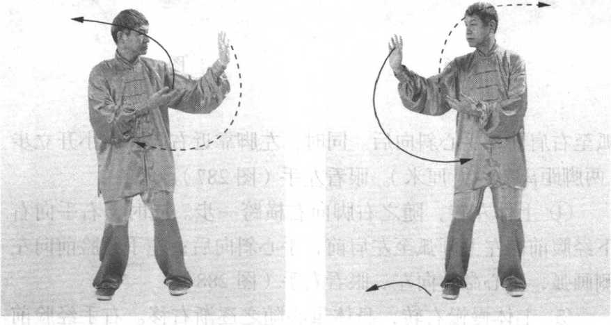 ① 上体稍右转,两脚不动。两手继续画立圆,右手经脸 前向右侧画弧,手心渐渐转向右方;左手向左下经腹前向右上 画弧至右肩前,手心斜向后。眼看左手(图285 )o