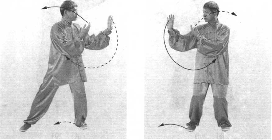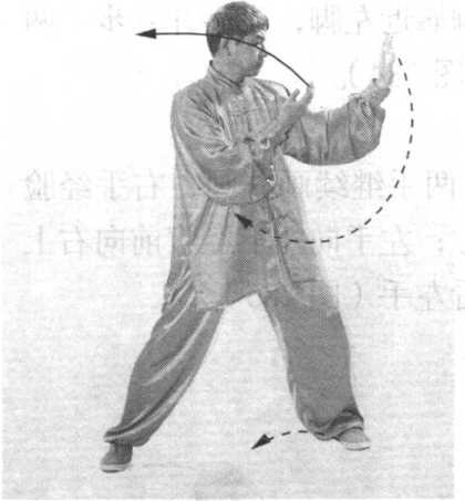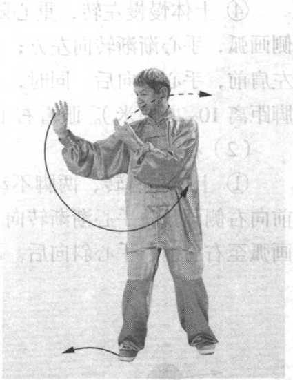 ② 上体慢慢左转,身体重心随之逐渐左移。左手经脸前 向左侧画弧,手心渐渐转向左方;右手向右下经腹前向左上画
