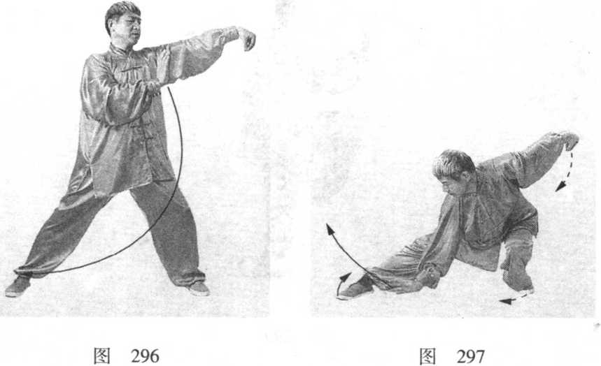 ② 左腿慢慢屈膝下蹲,右腿顺势向右侧伸出,成右仆步。 同时,右手下落(掌心向外)向右下顺右腿内侧向前穿出。眼 看右手(图297 )