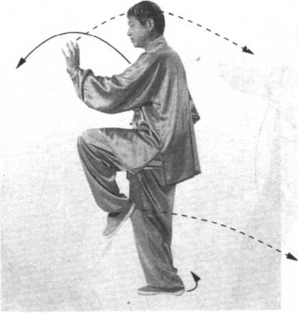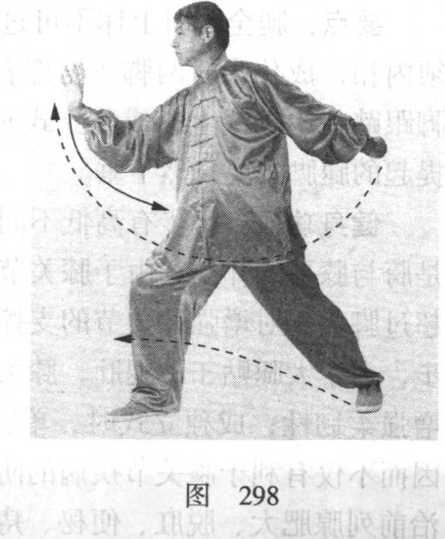 ④ 左腿慢慢提起平屈,成右独立式。同时,左勾手变掌, 并由后下方顺左腿外侧向前弧形摆出,屈臂立于左腿上方,肘 与膝相对,手心向右;右手翻按于右胯旁,手心向下,指尖向 前。眼看左手(图299 )o