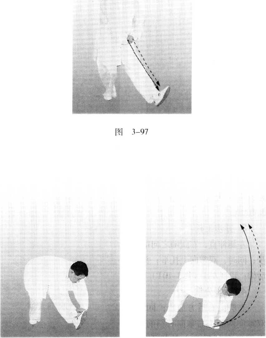 左脚向左前方上一步,脚 跟着地;同时,双手内收重叠 于左髓处,左手在K;目视双 手(图3-97)。上体前俯;双手 轻擦腿的正面至脚踝处;目随 左手(图3-98)。右腿蹬直;左 腿弯曲;双手推按脚背;身体 重心移至左脚(图3-99 )。