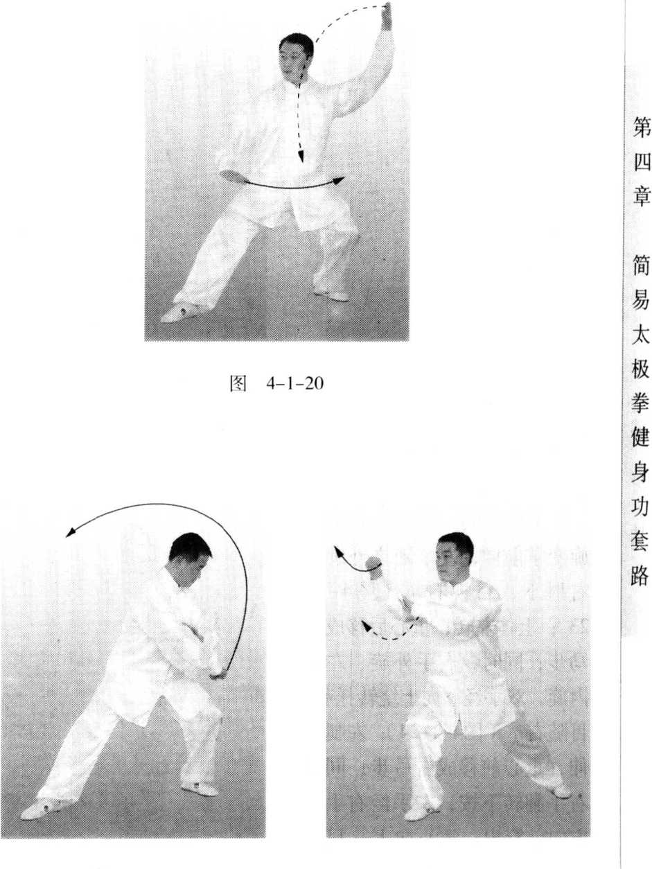 简 易 太 极 拳 健 身 功简 易 太 极 拳 健 身 功图 4-1-19图 4-1-19身体右转;同时,左掌向下外旋插至右腿外侧,掌心向 右,掌指向下;右臂屈肘收至左肩前.掌心向左,指尖向上; 目视左掌(图4-1-19);右腿蹬伸,重心向后移;同时,上体 左转后靠;左掌经上向后挥摆;右掌从左臂内侧下按至右腿上 方;目视右侧方(图4-1-20 )0上体继续左转;同时.右手握 拳内旋,后摆至小腹前,拳心向下,拳眼向内;左掌随之下落 至右前臂内侧,掌心向 下;头向左转,目视左 前方右拳(图4-1-21 ); 左腿蹬伸,重心前移, 成右弓步;同时,上体 右转,右拳向上经面前 翻转向前撇打,拳心斜 向上,高与头平;左掌 附于右前臂内侧;目视 右拳(图4-1-22 )o