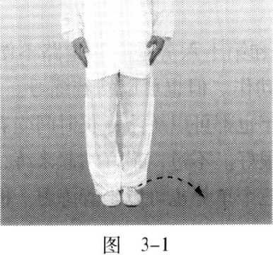 身体重心移至右腿;左脚跟至脚尖依次提起,向左侧开步 至与肩宽,然后脚尖至脚跟依次落地;身体重心移至两脚之间 (图 3-2 )。