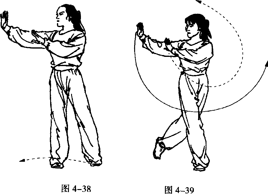 2 *士?泰炉?:; 士*士?泰炉?:; 士.右脚尖内扣,身体左转90。,重心右移。同 时,左手摆至右肩前(图叩38 )。