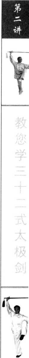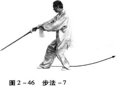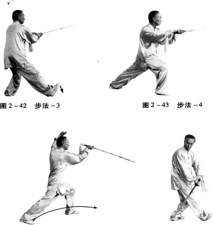动作要领:一腿支撑,另一腿提起经支撑腿内侧向前上步,脚跟 先着地,随着重心前移,全脚着地。(图2-4。、图2-41、图2-42、图2 - 43)