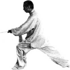 吐气踩实头顶天。 收剑落指托右前, 弓腿搂膝指正前, 上步引3旨旬前穿9