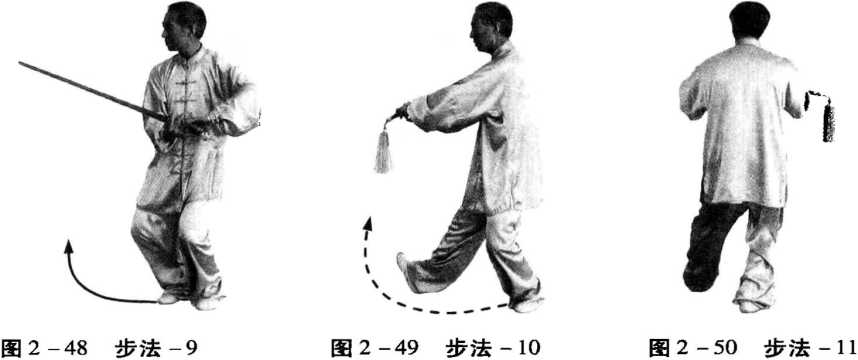 4 .摆步:动作要领:一腿支撑,另一腿提起,小腿外旋,向前外摆弧形上 步,脚跟先着地,脚尖外展,而后全脚着地。(图2-48、图2-49)
