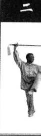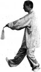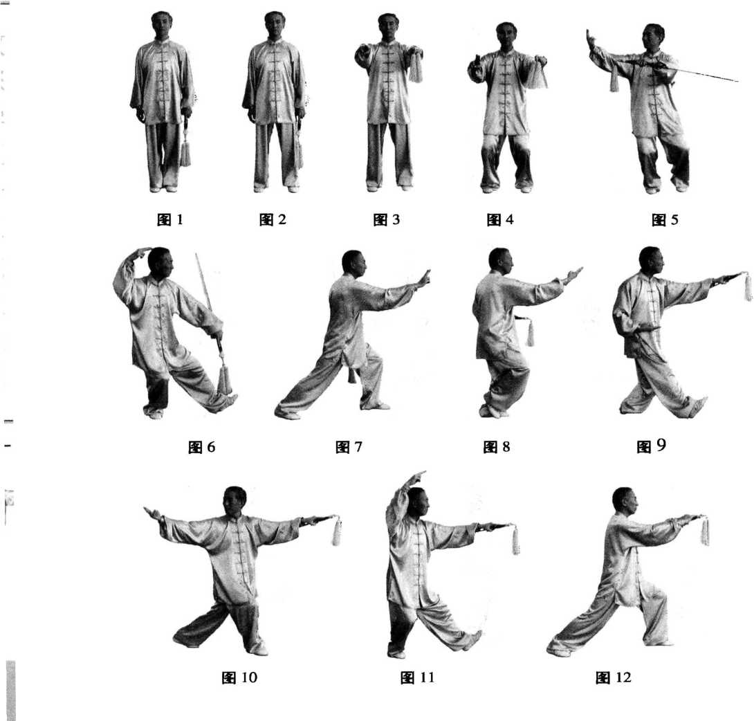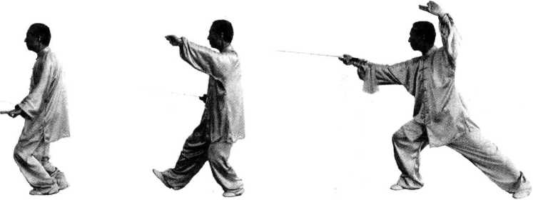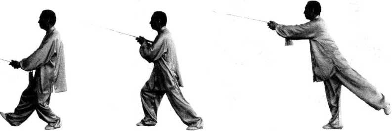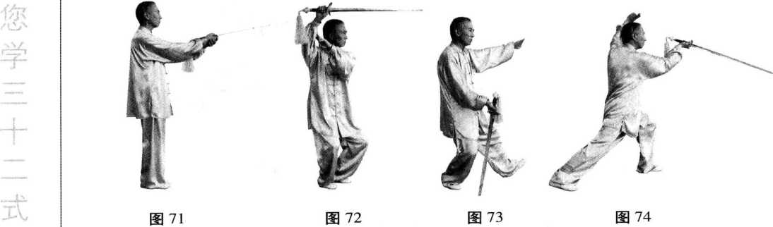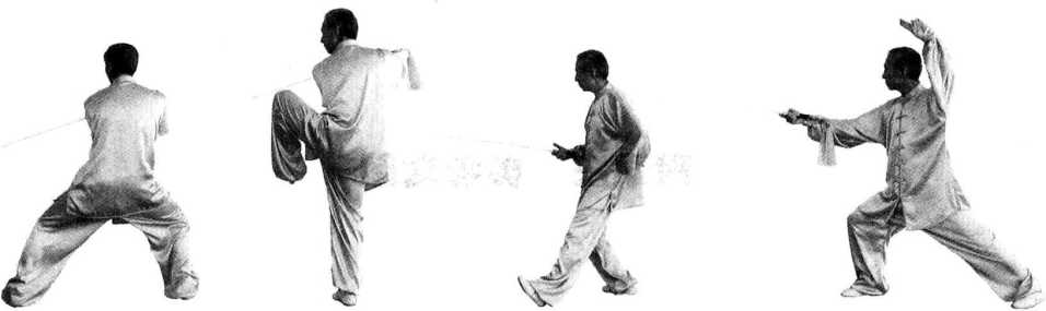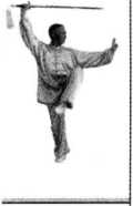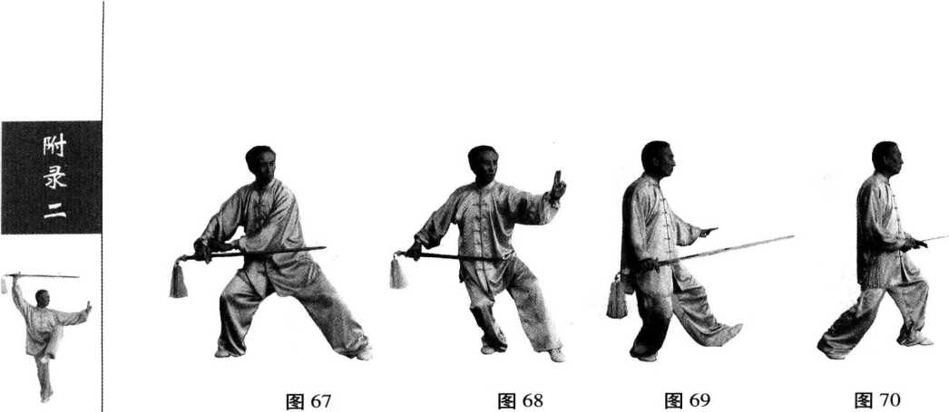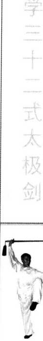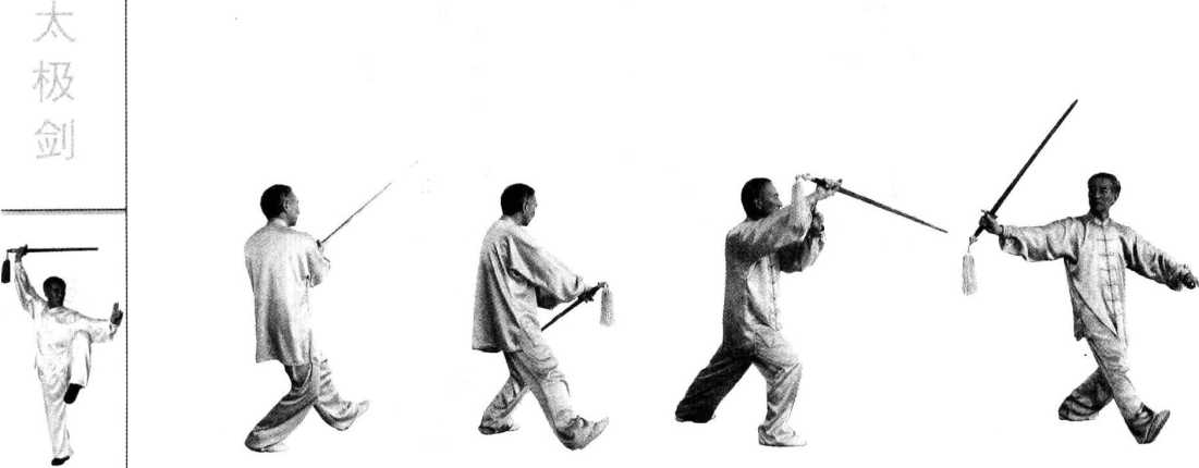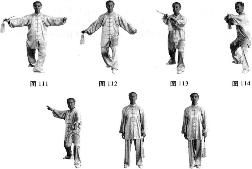 后移回抽交接剑,前移举指下落剑,上步开立落指剑, 收脚并步混元站。太极拳剑坚持练,却病延年保康建。