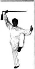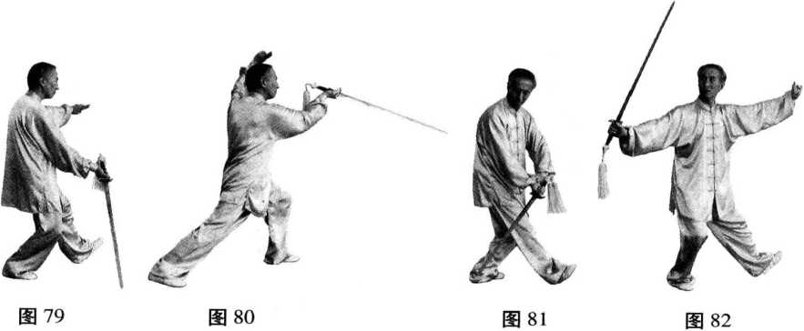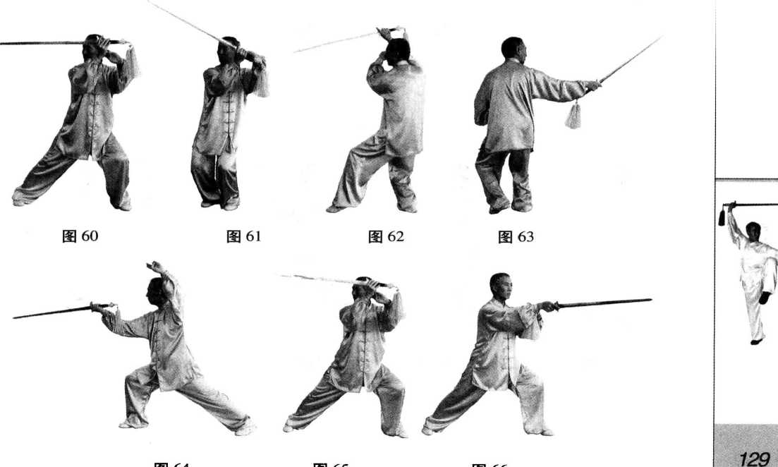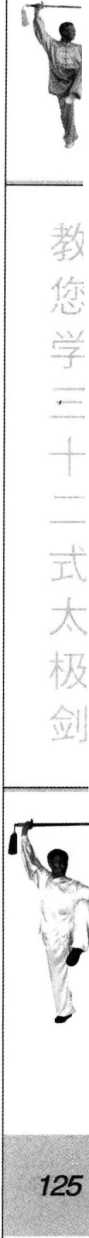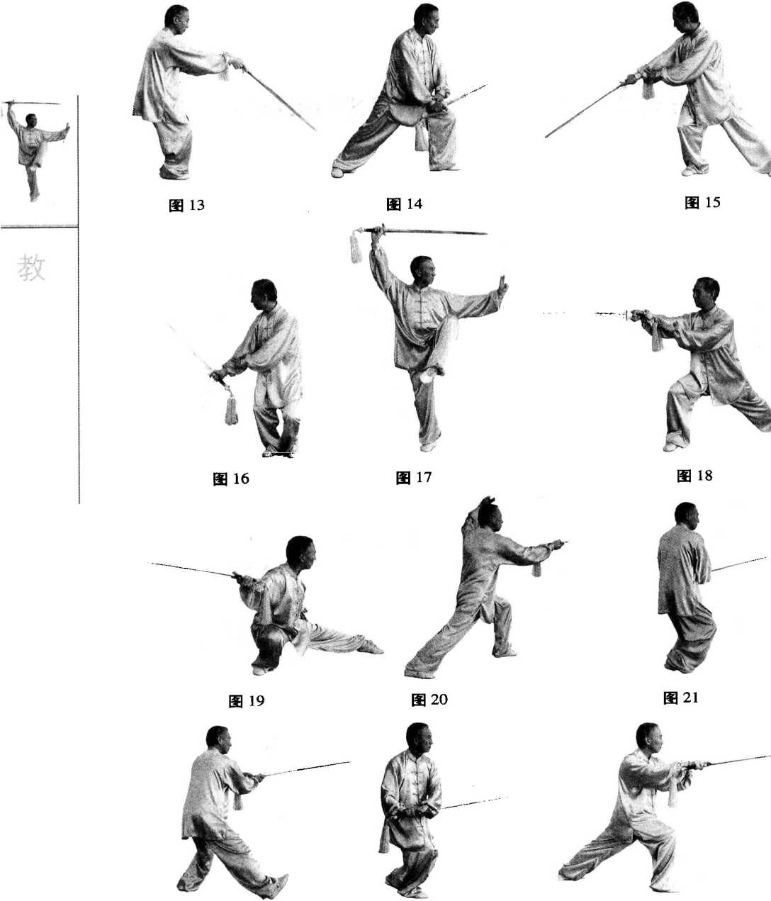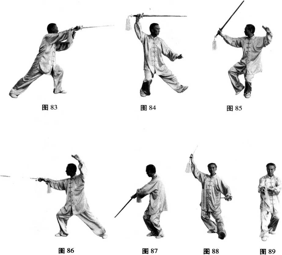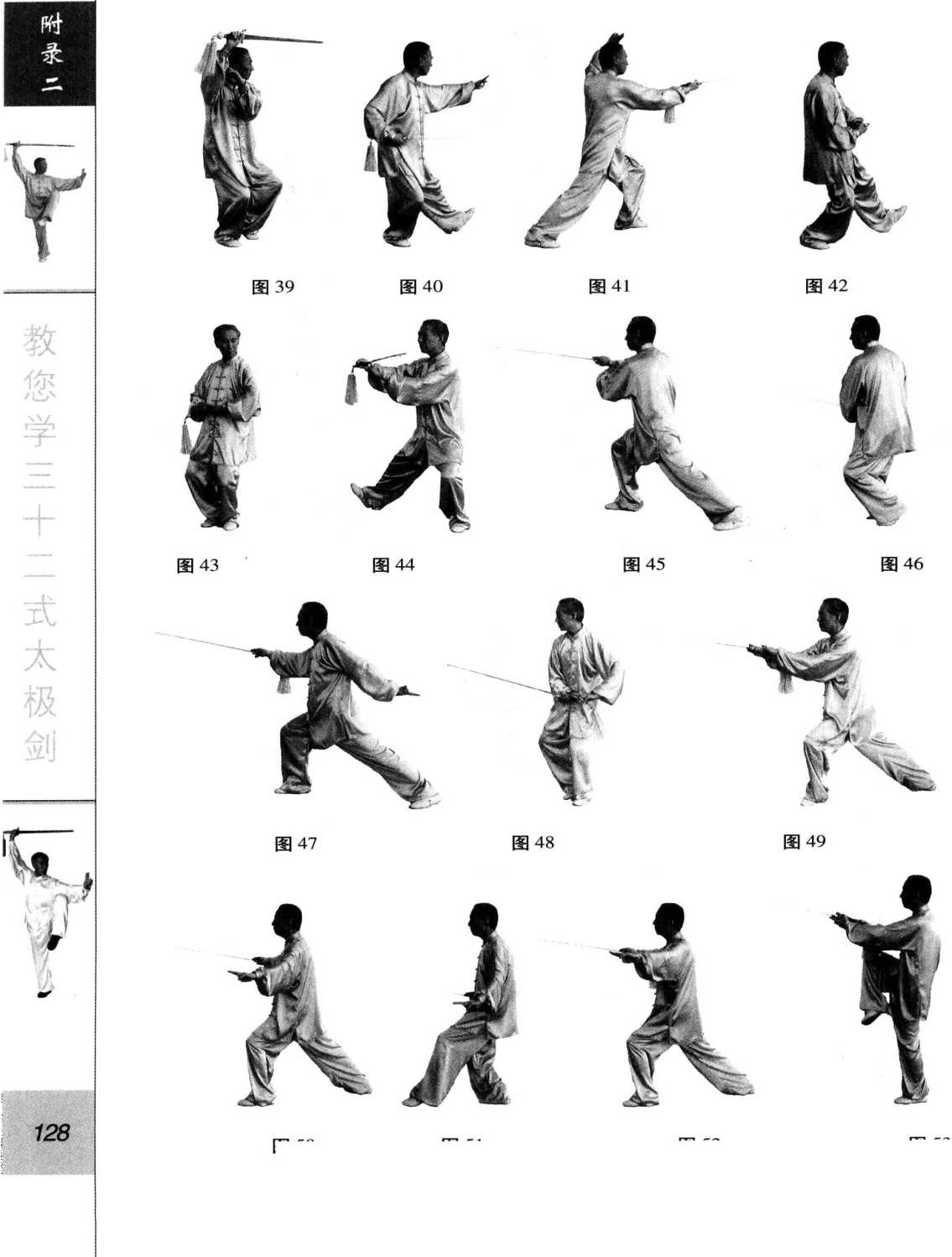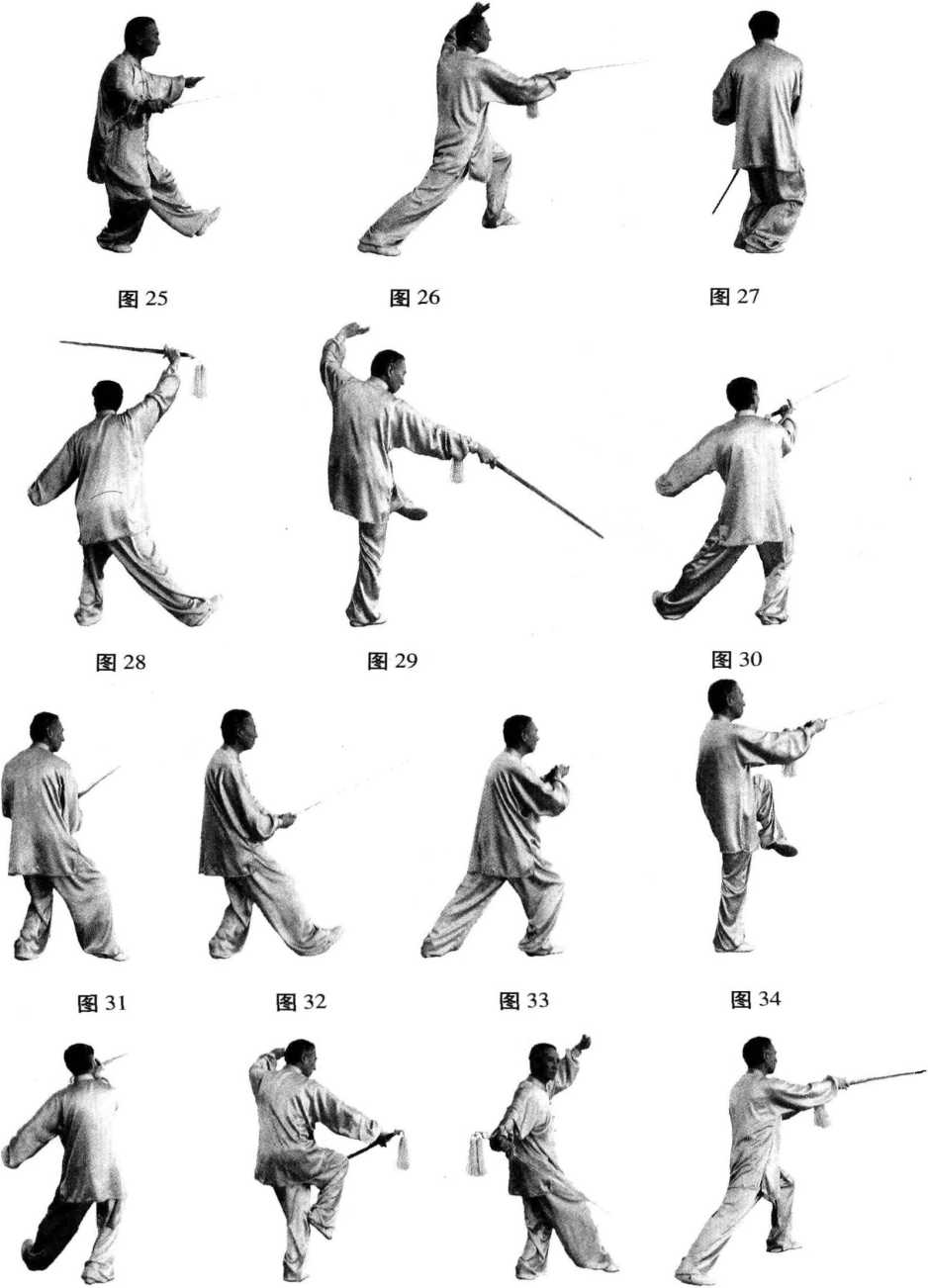 右脚插步外旋提, 26.弓步挂劈: 前落展脚左下挂, 27.虚步抡劈: 右转立剑身后引, 28.撤步反击: 撤步旋剑弓腿托, 29.进步平刺: 左移弓腿向左抹, 左落上步反穿指, 30. 丁步回抽: 后移收脚成丁步, 31.旋转平抹: 右前摆步身前抱, 转身撤步平抹剑, 32.弓步刺剑: 上步提剑弓步刺。 收势: 并步托剑刺正前。 上步落剑到腹前, 右脚上步下落剑, 左脚上步剑下落, 上步举指刺挑剑, 右转落剑右脚提, 左转上步上举剑, 腕花横剑转身移, 上步分指头上举, 左转上步头上举, 扣脚展脚弓步击。 右移右转提膝提, 剑正前瞧。