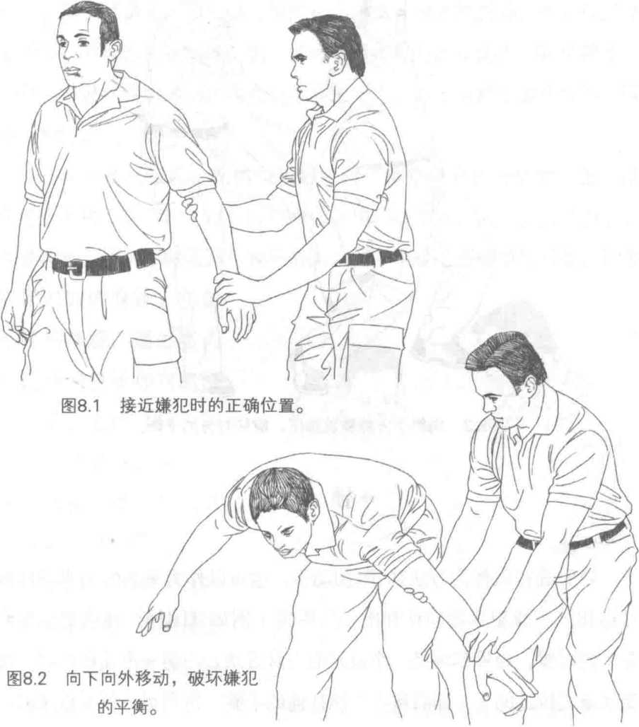着使用这项技术。在你发动攻击时要注意保持平衡。靠近嫌犯时两手要像钳子一样抓紧他的胳膊。一旦你抓住了嫌犯立即转移到他45度的位置保证自己的安全。至于站在他前面还是后面就取决于你希望嫌犯倒地的方向。然后用你的身体重量下压关键是注意不要使用蛮力利用体重协调好重心让身体的全部重量来协助你。将离你准备移动方向最近的脚迈出全身发力拉倒敌人。注意你的目的只是破坏敌人的平衡而不是攻击(如图81和图82)