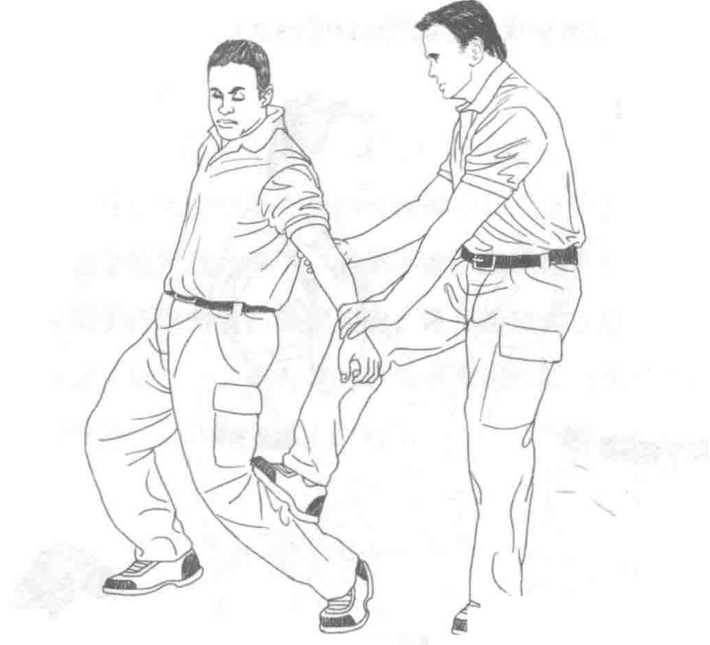 看起来是不是很简单(其实就是很简单)但只要采用适当的身体力学原理就可以起到四两拨千斤的效果。你不一定非要抓住嫌犯的手腕和肘部也可以抓住二头肌、皮带、肩膀或者衣领这个效果同样有效。当你抓住衣领的时候首先将对方拉向他的脚后跟然后下沉身体。如果你觉得这一动作还不足以控制住对方还可以在他迈开脚步前先用脚踹嫌犯的膝盖来破坏他的平衡(如图83)