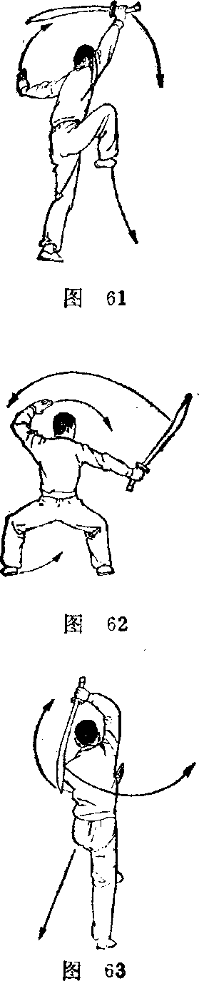 四、在空中,上体继续向左翻转。 身体翻转一周后,左脚落地,直腿站 立,右腿屈膝提于身体的右前方c此 时,右手持刀上举,刀刃朝上,刀尖 朝左后方,左掌则从上向下、向身体 左后方绕行。(图61)|甲组刀术图解
