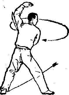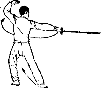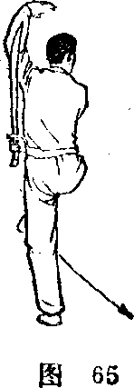 ① 两腿稍立起,随后右腿伸直站 立,左腿屈膝提于身前。与此同时, 左掌屈肘向右腋处插伸;右臂内旋, 使刀尖朝下,从右向前、向左顺左臂 外侧向左后方绕行° (图63)