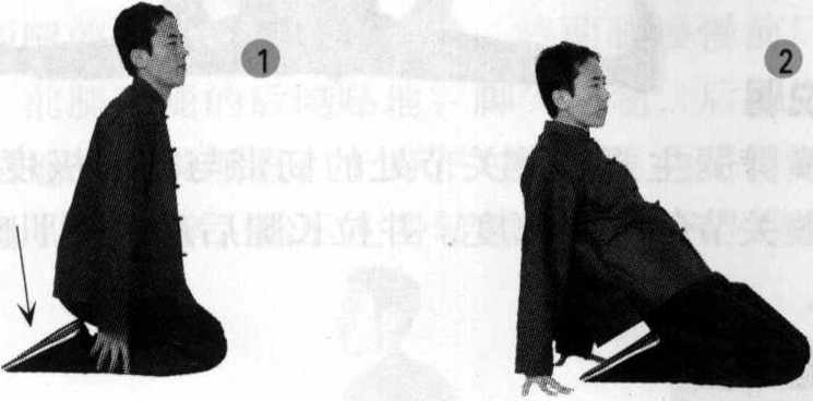 两腿并拢,屈膝成跪姿,脚背绷平,两手分别垂于 身体两侧,使臀部下落坐在足跟上,两手在体后着地支 撑,上体成后仰,使脚踝被用力跪压(图1、2)。