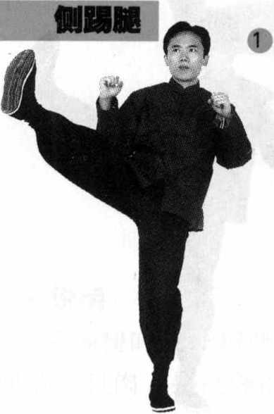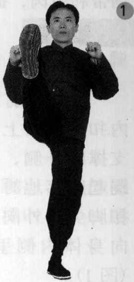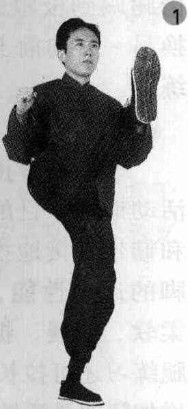 方向猛踢,两眼平视前方(图1), 借腿踢到极限的回弹之力下落时, 换另一脚向前上方踢出,两腿交替 练习。