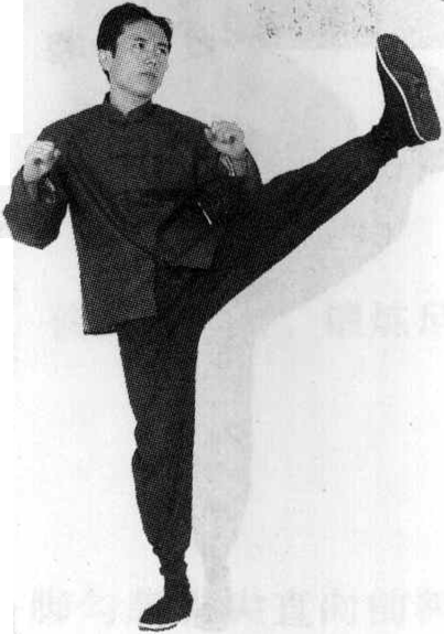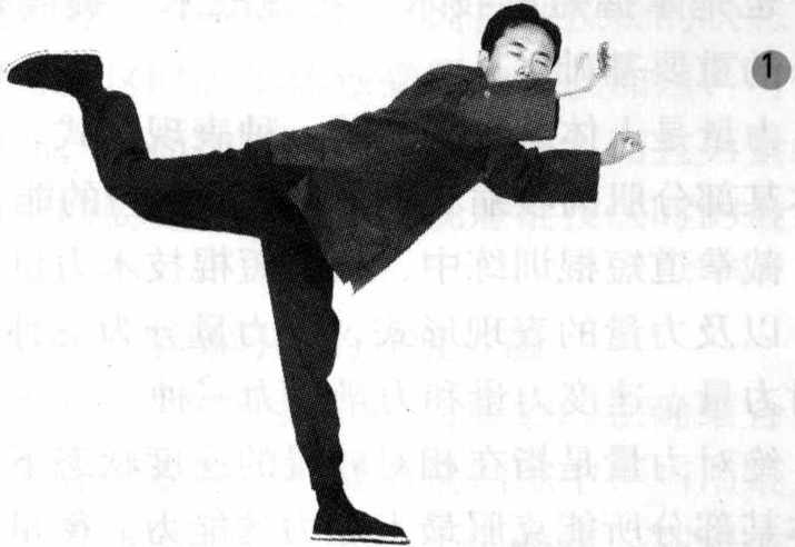 一脚向前上步时,另一 脚脚尖绷直由身体内侧向上 经面前向外侧上方外摆踢出, 直腿落在支撑脚旁,眼看前 方(图1),然后另一支撑脚 脚尖绷直经身体内侧向上经