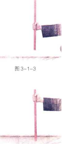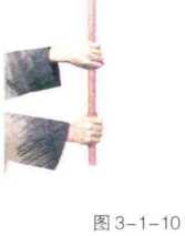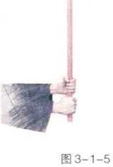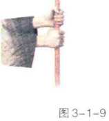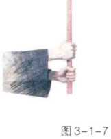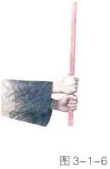 身体自然站立,双手自然用力握住短棍3/4处,左手心 向右,右手心向左(图或者一手握短棍的末端 处,另一手握短棍的3/4处(图3-1-7),或两手交换位置 握棍,保持双手的灵活(图3-1-8)。