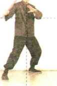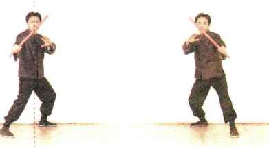 其他方法要领一致,即头部略向前含低,下须稍内收紧靠近锁骨处,自然闭口合齿,面部 表情自然,双眼注视前方。含胸拔背,放松沉肩,躯干处于适度的自然生理状态,以利蓄 势聚劲。前手自然用力握棍,手腕放松,后手撑开成掌防守并随时变化,两肘屈蓄,欲有 掩腋(护肋)之势,短棍则随时上、中、下防护左右两侧身体要害。两腿膝成警戒桩式马 步姿势,身体重心略偏于后脚,随时准备灵巧移动双脚,并维持好平衡。全身姿势以舒 适、自然、放松、协调为原则。