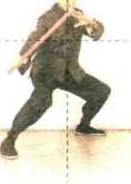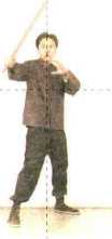 这是基本的警戒桩式持单棍式,用前手持短棍,其目的是做好突然动作的准备,同时 可控制战局,攻守兼备。这个姿势从上到下都要协调放松,棍与精神、肉体融合为一。通 过左、右持棍式的反复练习,可增进全身的灵活协调。