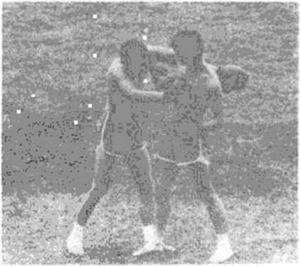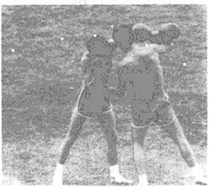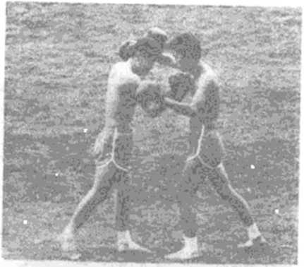 对方进步变刺拳为左直拳攻击我方面部、心窝时,即以右臂 格挡摆开,同时上体前倾,以左勾拳打击对方胃部、软腹,随即左 转身,右摆肘横击其歌侧、左胸部(图146、图147),或连接右上 膝猛撞对方胸膛。图146对方突然发出右直拳攻击我方上盘时.即以左臂上架开,同 时重心前移以右上击拳击对方下颔心窝,随即稍上右脚,变拳为 右撬肘撬击其胃腹部下巴(图148、图149)。图148