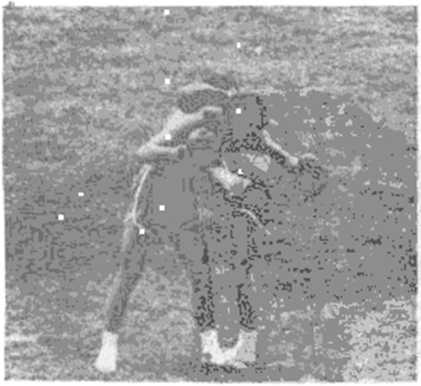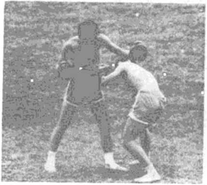 对方进步猝然挥动左摆拳(或左平勾拳)重击我方耳根、额 侧时,我迅速向右斜前侧下蹲躲过,随即双手反抱对方后腰部, 用左侧膝猛撞其腹部,再接左剁肘砸击其背部(图166、图167)o图16612. 后仰身防连左侧踹踢反击对方若以左、右摆拳(或平勾拳)连续猛击我方太阳穴、耳根 或颈侧时,即向后仰身防,使攻击拳在面前掠过,随即用左脚重 复侧踹踢其腹部面部(图168、图169)。图168