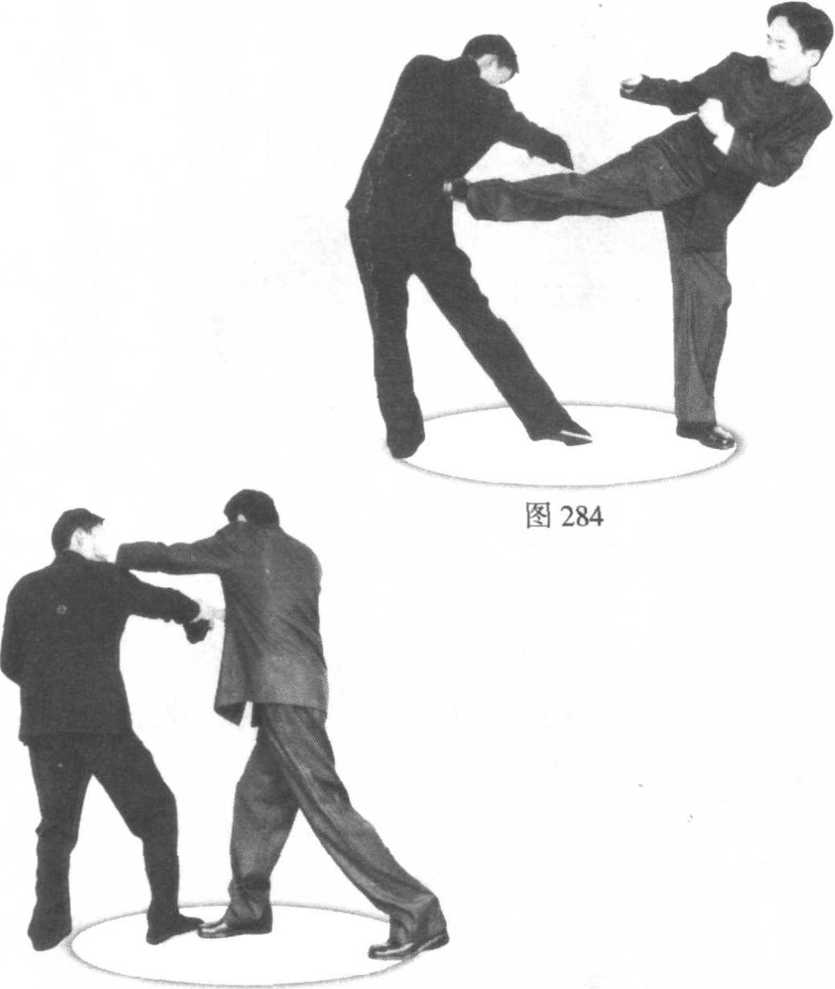 截拳道截拳道我方移步,看准对手中段空门,起脚侧踢对 手。对手被击中时,我方接着以前手缠挡对手前手,后手 直拳再次攻击对手面部(图282 ~图285 )o图285