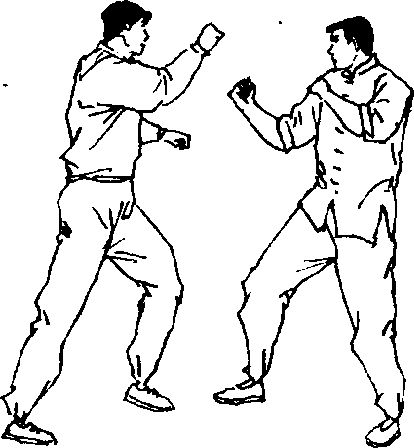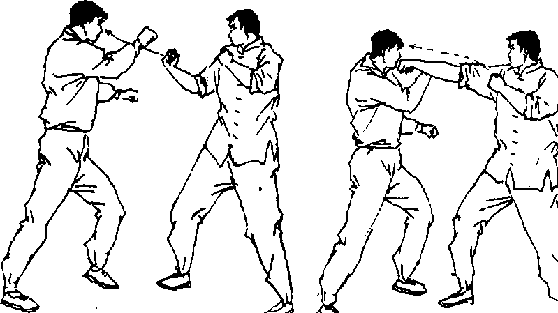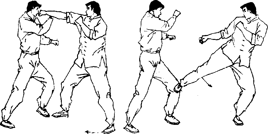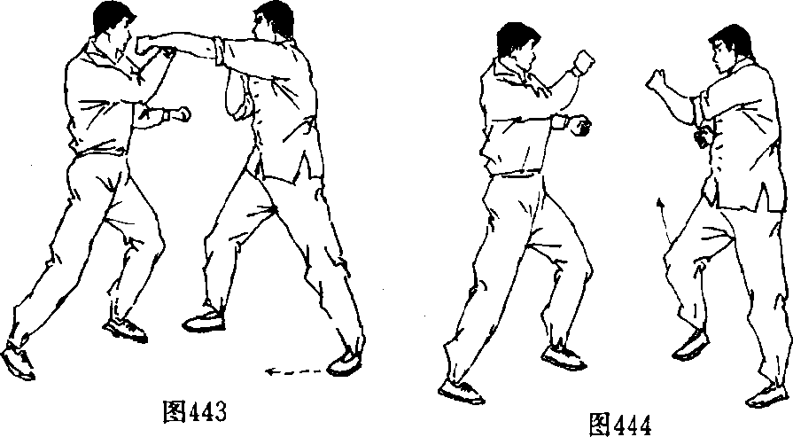 动作要领:在实战中运用本招法时,开始的假动作必须放 得长而且向纵深插入,但是动作要快,以便引诱对手格挡。紧 接着在对手还没有还原之前,便狠狠地打击他。而且据李小龙 解释,第一次假动作攻击必须迫使对手进行防御,在这一瞬 间,即在发出短而真实的踢击之前,为了做近距离的假动作, 那么与对手就更加接近了。这是假动作运用的更高级形式,如