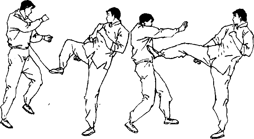 果对手没有上第一个假动作的当,那么,第二个“长”的假动作 就要造成对手会以为这是组合打击法的最终一击的错误判 断,从而诱使他进行格挡并暴露出我方所要攻击的空当。而紧 接其后的正踹腿一定要狠、要准,同时还要想象此脚的杀伤力 好象要穿透到对手的背面去,果真的话,自能一脚制敌。