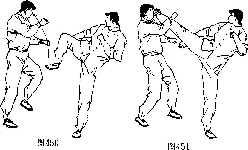 对手上钩后,李小龙便不失时机的向对手头部攻击一记既快 又狠的勾踢腿去重创其太阳穴(图450、图451),将其踢昏或 踢倒在地。