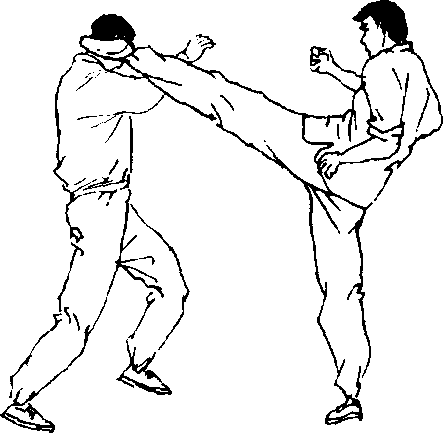 在截拳道中,由于这种腿法的打击力量不足以踢伤对手, 故严格地说,此腿法只能用于对面部的高踢攻击,而且采用这 种腿法通常是作为一种出其不意的战术来运用。运用此招法 对付右手在前而又只注意保护身体左侧的粗心大意的对手, 极易奏效,因为此腿法的运行路线偏离了对手的视线范围,故 命中率极高。
