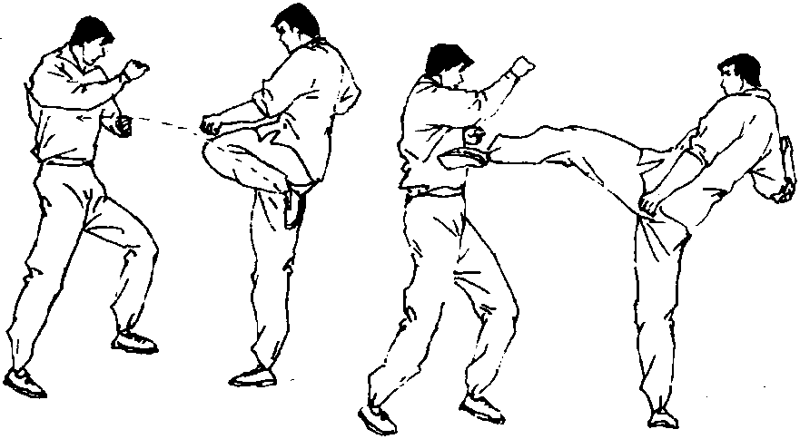 李小龙在实战中常用的 拳法与扫踢腿相结合的组合 打击法如下。