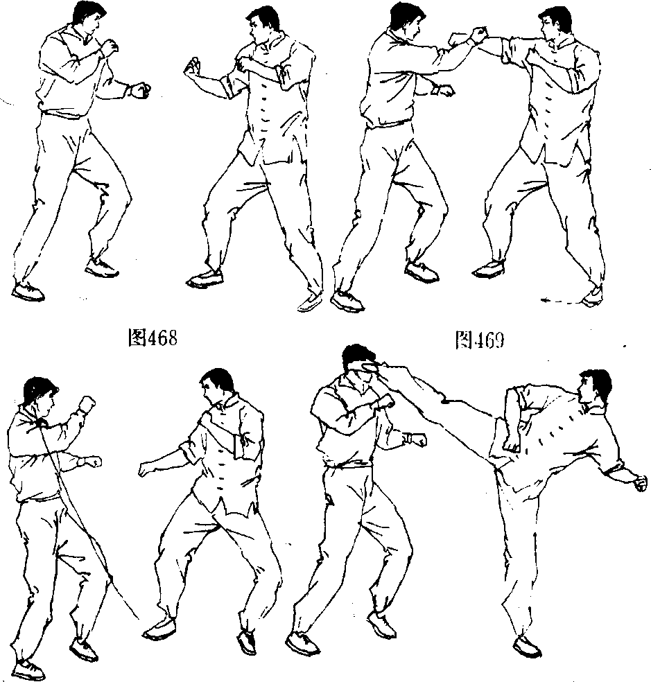 运用方法:可由戒备势开始(图468),对付一个右手在前 的对手时,李小龙抢先发起攻击,用一记前手直拳分散对手的 注意力(图469);接着,左脚迅速跟进,与此同时,抬起右脚重 创对手面部或头部要害处(图470、图471),将其踢伤或踢倒 在地。