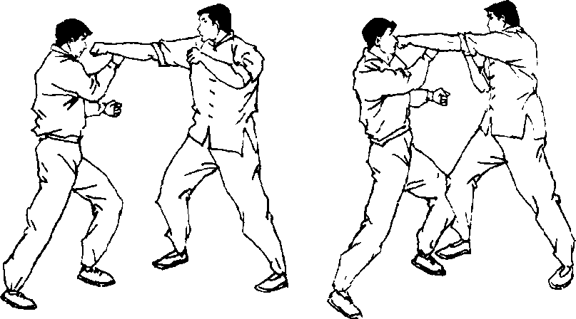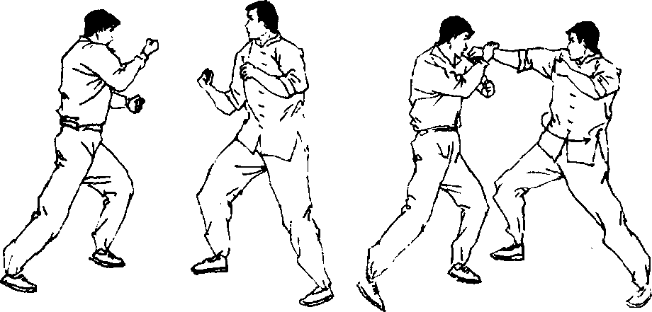 这种“短一一长——短”型的攻击节奏中,是假动作运用的最 高级形式,如果对手没有上第一个假动作的当,那么第二个 “长”的假动作就要造成对手以为这是组合进攻中的最终一击 的错误判断,从而诱使他进行错误的反应,而我方的最后一拳 自然会准确地击中对手的要害部位。