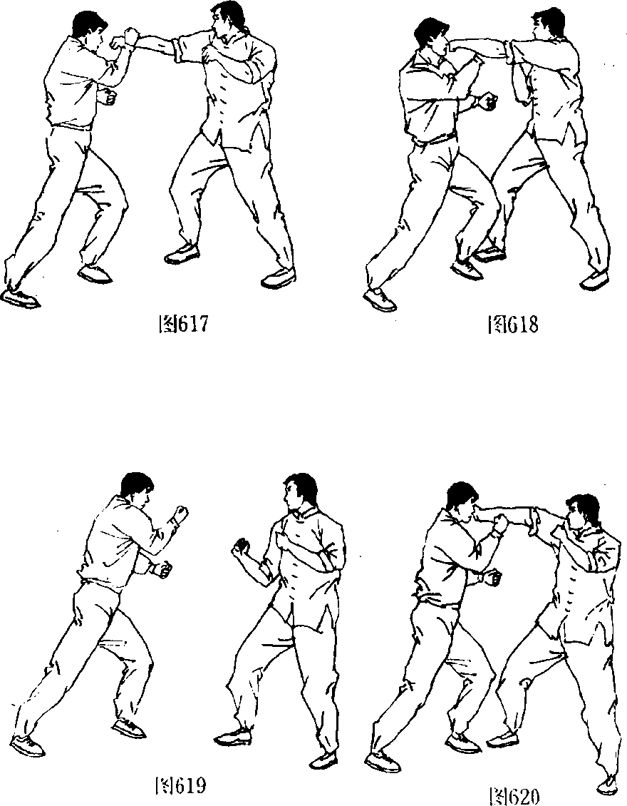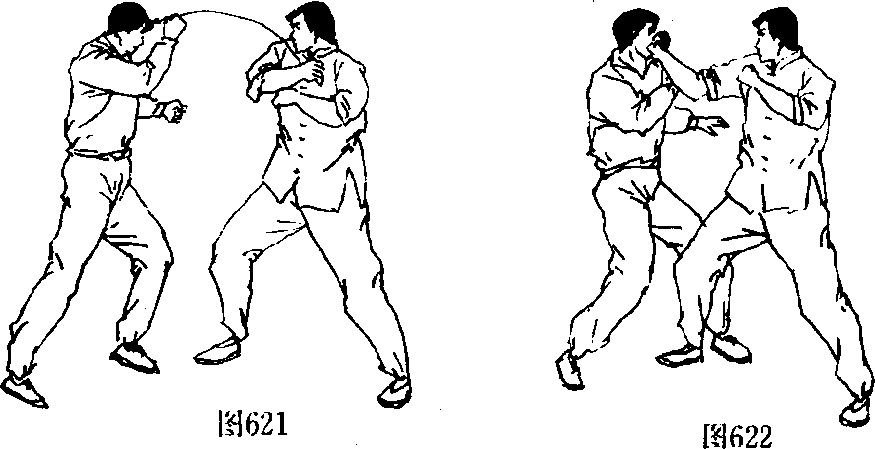 用时也甚为安全;最后可再用强劲有力的右手摆拳击向已摇 摇欲坠的对手的头部(图619、图620),如此时仍没击倒对手, 可再在右手略回收后(图621),再以一记迅猛的右手反背拳 击向对手太阳穴(图622),将其击昏或击倒在地。